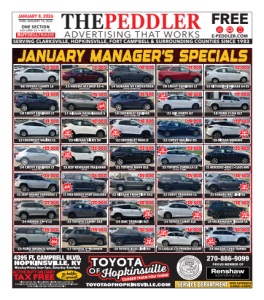 SERVING CLARKSVILLE, HOPKINSVILLE, FORT CAMPBELL & SURROUNDING COUNTIES SINCE 1983 E-PEDDLER.COM FREE BUYSELLTRADE THEPEDDLER ADVERTISING THAT WORKS JANUARY 8, 2026 THRU JANUARY 14, 2026 ONE SECTION VOLUME 43 • NO. 22