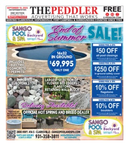 SERVING CLARKSVILLE, HOPKINSVILLE, FORT CAMPBELL & SURROUNDING COUNTIES SINCE 1983 E-PEDDLER.COM FREE BUYSELLTRADE THEPEDDLER ADVERTISING THAT WORKS SEPTEMBER 18, 2025 THRU SEPTEMBER 24, 2025 ONE SECTION VOLUME 43 • NO. 7 With this coupon. Not valid with any other offers or prior services. Offer expires 12/10/24. $50 OFF in-ground pool closing SANGO POOL & SPA With this coupon. Not valid with any other offers or prior services. Offer expires 12/10/24. $25 OFF above ground pool closing SANGO POOL & SPA With thi $2 S SCAN HERE FOR FREE ESTIMATE 24 FOOT ROUND ABOVE GROUND POOL only $ 8,999 POOLS IN-GROUND starting at $ 59,995 KITCHENS ABOVE GROUND POOLS WWW.SANGOPOOLANDSPA.COM WEEK 1pm · Closed Sunday · Saturday 8am-12pm · Closed Sunday Includes Pump & Filter, Hand Rail & Ladder, Maintenance Kit, 4ft-8ft on Ends of Concrete, Pool Light, All Permits & Electrical "Paul and the entire team of Sango Pool and Spa have gone above and beyond to make our dream of having an inground pool a reality! I placed a phone call to Sango, and the very next day Paul came to our home to give us an estimate. At the office, Lisa made the entire process a breeze and she was always available to answer our questions. The crew that installed our pool was absolutely amazing! In fact, all the people who came to our home, from the time we began digging, and during the installation, electric, pouring the concrete, grading the yard, etc. were not only professional, but a pleasure to be around. My family and I will 100% recommend the amazing team at Sango pool and Spa!!!" Juliana C. VMS5738565 9/24/2024 8:43:00 AM With this coupon. Not valid with any other offers or prior services. Offer expires 12/10/24. $50 OFF in-ground pool closing SANGO POOL & SPA With this coupon. Not valid with any other offers or prior services. Offer expires 12/10/24. $25 OFF above ground pool closing SANGO POOL & SPA With thi $2 S SCAN HERE FOR FREE ESTIMATE OUTDOOR KITCHENS starting at $ 6,995 24 FOOT ROUND ABOVE GROUND POOL only $ 8,999 POOLS IN-GROUND starting at $ 59,995 K OUTDOOR KITCHENS ABOVE GROUND POOLS · 931-358-3811 · WWW.SANGOPOOLANDSPA.COM RTS & SERVICE 6 DAYS A WEEK am-6pm · Saturday 8am-1pm · Closed Sunday onday - Friday 8am-5pm · Saturday 8am-12pm · Closed Sunday Includes Pump & Filter, Hand Rail & Ladder, Maintenance Kit, 4ft-8ft on Ends of Concrete, Pool Light, All Permits & Electrical "Paul and the entire team of Sango Pool and Spa have gone above and beyond to make our dream of having an inground pool a reality! I placed a phone call to Sango, and the very next day Paul came to our home to give us an estimate. At the office, Lisa made the entire process a breeze and she was always available to answer our questions. The crew that installed our pool was absolutely amazing! In fact, all the people who came to our home, from the time we began digging, and during the installation, electric, pouring the concrete, grading the yard, etc. were not only professional, but a pleasure to be around. My family and I will 100% recommend the amazing team at Sango pool and Spa!!!" Juliana C. VMS5738565 9/24/2024 8:43:00 AM With this coupon. Not valid with any other offers or prior services. Offer expires 12/10/24. $50 OFF in-ground pool closing SANGO POOL & SPA With this coupon. Not valid with any other offers or prior services. Offer expires 12/10/24. $25 OFF above ground pool closing SANGO POOL & SPA With this $2 S SCAN HERE FOR FREE ESTIMATE OUTDOOR KITCHENS starting at $ 6,995 24 FOOT ROUND ABOVE GROUND POOL only $ 8,999 POOLS IN-GROUND starting at $ 59,995 PRIMO GRILLS IN STOCK OUTDOOR KITCHENS ABOVE GROUND POOLS S · CLARKSVILLE · 931-358-3811 · WWW.SANGOPOOLANDSPA.COM PARTS & SERVICE 6 DAYS A WEEK Monday - Friday 8am-6pm · Saturday 8am-1pm · Closed Sunday OURS BEGIN NOV. 1 · Monday - Friday 8am-5pm · Saturday 8am-12pm · Closed Sunday JACK DANIEL'S PRIMO GRILL $ 1,495 Includes Pump & Filter, Hand Rail & Ladder, Maintenance Kit, 4ft-8ft on Ends of Concrete, Pool Light, All Permits & Electrical "Paul and the entire team of Sango Pool and Spa have gone above and beyond to make ur dream of having an inground pool a reality! I placed a phone call to Sango, and the very next day Paul came to our home to give us an estimate. At the office, Lisa made the entire process a breeze and she was always available to answer our questions. The crew that installed our pool was absolutely amazing! In fact, all the people who came to our home, from the time we began digging, and during the installation, electric, pouring the concrete, grading the yard, etc. were not only professional, but a pleasure to be around. My family and I will 100% recommend the amazing team at Sango pool and Spa!!!" Juliana C. VMS5738565 gazine, LLC 9/24/2024 8:43:00 AM With this coupon. Not valid with any other offers or prior services. Offer expires 12/10/24. $50 OFF in-ground pool closing SANGO POOL & SPA With this coupon. Not valid with any other offers or prior services. Offer expires 12/10/24. $25 OFF above ground pool closing SANGO POOL & SPA With this $2 S SCAN HERE FOR FREE ESTIMATE HOT TUBS as low as $ 6,995 OUTDOOR KITCHENS starting at $ 6,995 24 FOOT ROUND ABOVE GROUND POOL only $ 8,999 POOLS IN-GROUND starting at $ 59,995 PRIMO GRILLS IN STOCK OUTDOOR KITCHENS ABOVE GROUND POOLS UBS IN STOCK 2800 HWY. 41A S · CLARKSVILLE · 931-358-3811 · WWW.SANGOPOOLANDSPA.COM PARTS & SERVICE 6 DAYS A WEEK Monday - Friday 8am-6pm · Saturday 8am-1pm · Closed Sunday WINTER HOURS BEGIN NOV. 1 · Monday - Friday 8am-5pm · Saturday 8am-12pm · Closed Sunday JACK DANIEL'S PRIMO GRILL $ 1,495 MULTIPLE SIZES AVAILABLE IN OUR SHOW ROOM Includes Pump & Filter, Hand Rail & Ladder, Maintenance Kit, 4ft-8ft on Ends of Concrete, Pool Light, All Permits & Electrical "Paul and the entire team of Sango Pool and Spa have gone above and beyond to make our dream of having an inground pool a reality! I placed a phone call to Sango, and the very next day Paul came to our home to give